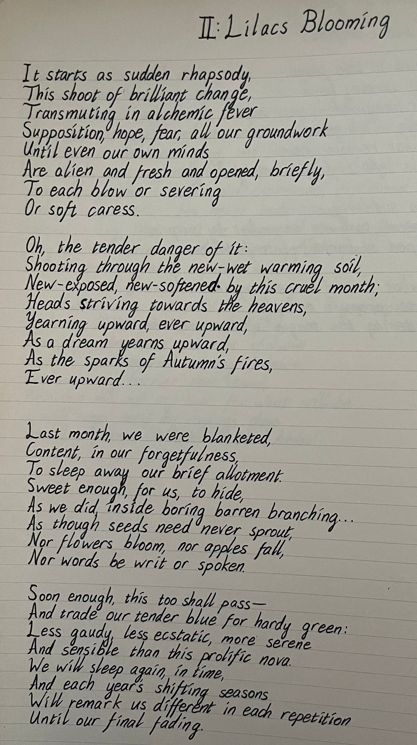It starts as sudden rhapsody, This shoot of brilliant change, Transmuting in alchemic fever Supposition, hope, fear, all our groundwork Until even our own minds Are alien and fresh and opened, briefly, To each blow or severing Or soft caress. Oh, the tender danger of it: Shooting through the new-wet warming soil, New-exposed, new-softened by this cruel month; Heads striving towards the heavens, Yearning upward, ever upward, As a dream yearns upward, As the sparks of Autumn’s fires, Ever upward… Last month, we were blanketed, Content, in our forgetfulness, To sleep away our brief allotment. Sweet enough, for us, to hide, As we did inside boring barren branching… As though seeds need never sprout, Nor flowers bloom, nor apples fall, Nor words be writ or spoken. Soon enough, this too shall pass— And trade our tender blue for hardy green: Less gaudy, less ecstatic, more serene And sensible than this prolific nova. We will sleep again, in time, And each year’s shifting seasons Will remark us different in each repetition Until our final fading.