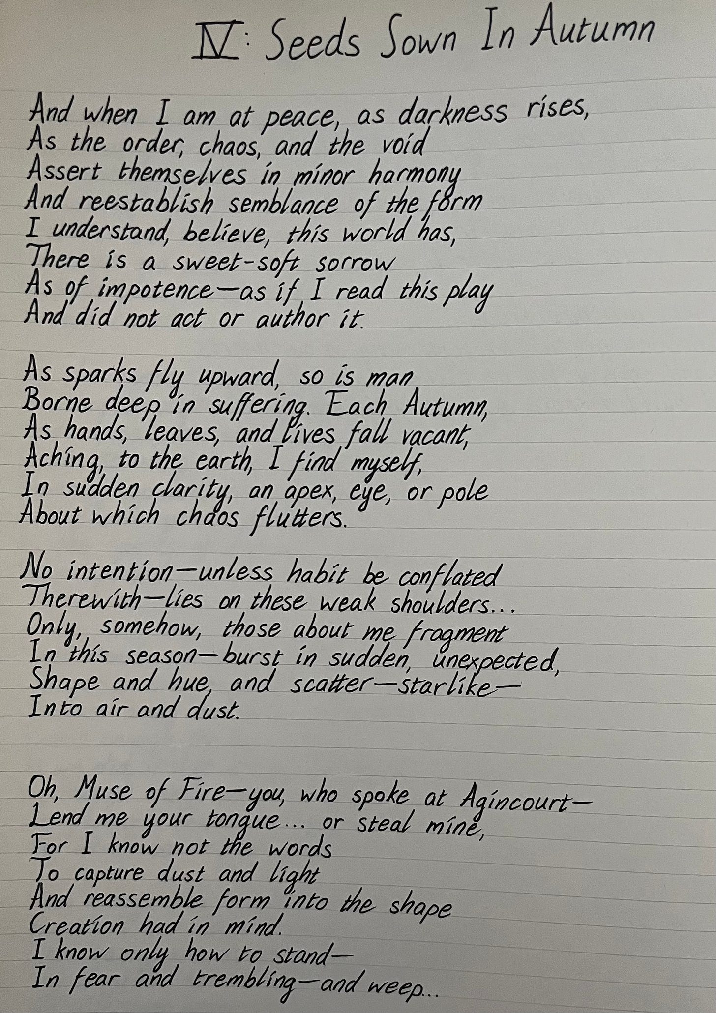 And when I am at peace, as darkness rises, As the order, chaos, and the void Assert themselves in minor harmony And reestablish semblance of the form I understand, believe, this world has, There is a sweet-soft sorrow As of impotence—as if I read this play And did not act or author it. As sparks fly upward, so is man Borne deep in suffering. Each Autumn, As hands, leaves, and lives fall vacant, Aching, to the earth, I find myself, In sudden clarity, an apex, eye or pole About which chaos flutters. No intention—unless habit be conflated Therewith—lies on these weak shoulders... Only, somehow, those about me fragment In this season—burst in sudden, unexpected, Shape and hue and scatter—starlike— Into air and dust. Oh, Muse of Fire—you, who spoke at Agincourt— Lend me your tongue... or steal mine, For I know not the words To capture dust and light And reassemble form into the shape Creation had in mind. I know only how to stand— In fear and trembling—and weep...