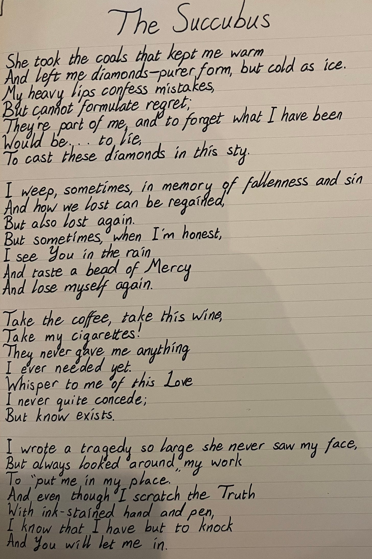 She took the coals that kept me warm And left me diamonds—purer form, but cold as ice. My heavy lips confess mistakes, But cannot formulate regret; They're part of me, and to forget what I have been Would be... to lie, To cast these diamonds in this sty. I weep, sometimes, in memory of fallenness and sin And how we lost can be regained, But also lost again. But sometimes, when I'm honest, I see You in the rain And taste a bead of Mercy And lose myself again. Take the coffee, take this wine, Take my cigarettes! They never gave me anything I ever needed yet. Whisper to me of this Love I never quite concede; But know exists. I wrote a tragedy so large she never saw my face, But always looked around my work To "put me in my place." And even though I scratch the Truth With ink-stained hand and pen, I know that I have but to knock And You will let me in.