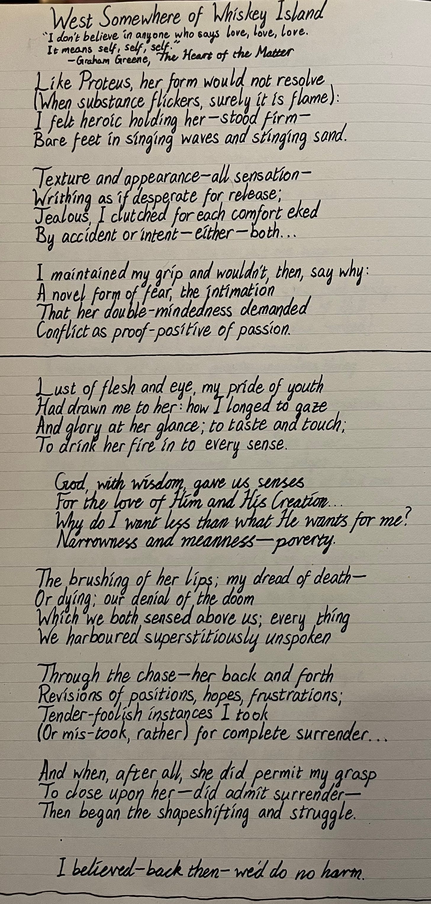 Like Proteus, her form would not resolve (When substance flickers, surely it is flame): I felt heroic holding her—stood firm— Bare feet in singing waves and stinging sand.