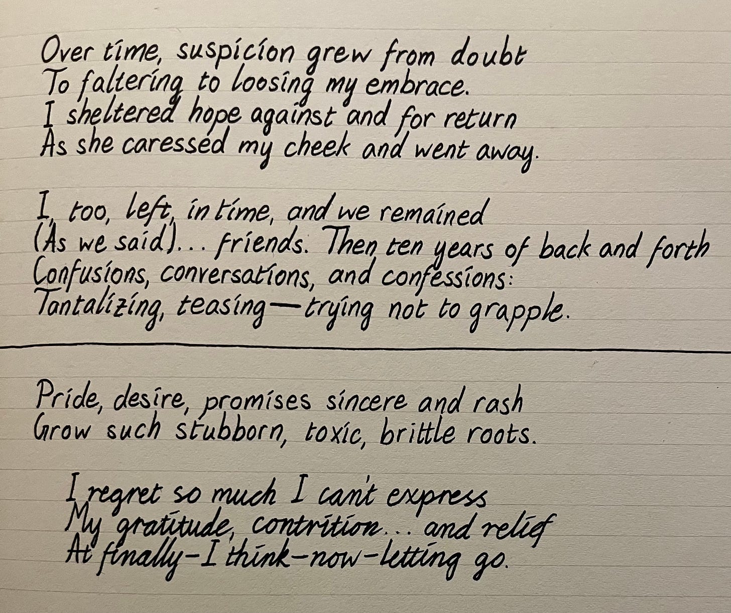 I believed—back then—we’d do no harm.Over time, suspicion grew from doubt To faltering to loosing my embrace. I sheltered hope against and for return As she caressed my cheek and went away.